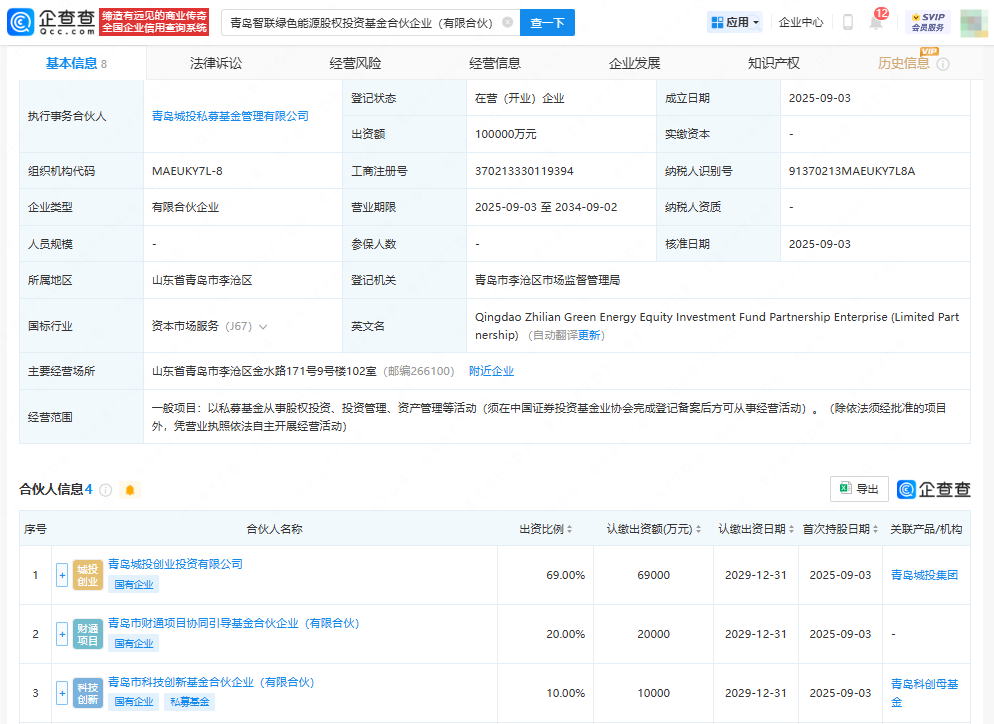 近日,青岛智联绿色能源股权投资基金合伙企业(有限合伙)成立,执行事务合伙人为青岛城投私募基金管理有限公司,出资额10亿元人民币,经营范围涉及以私募基金从事股权投资、投资管理、资产管理等活动。企查查股权穿透显示,该基金由青岛城投创业投资有限公司、青岛市财通项目协同引导基金合伙企业(有限合伙)、青岛市科技创新基金合伙企业(有限合伙)等共同出资。